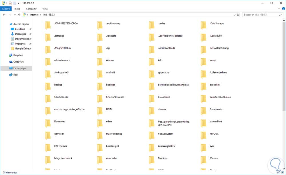 Al pulsar en Iniciar sesión podremos navegar en todas las carpetas de Android sin problema: