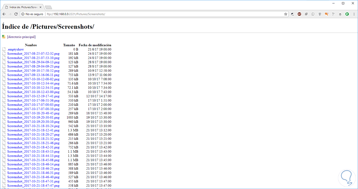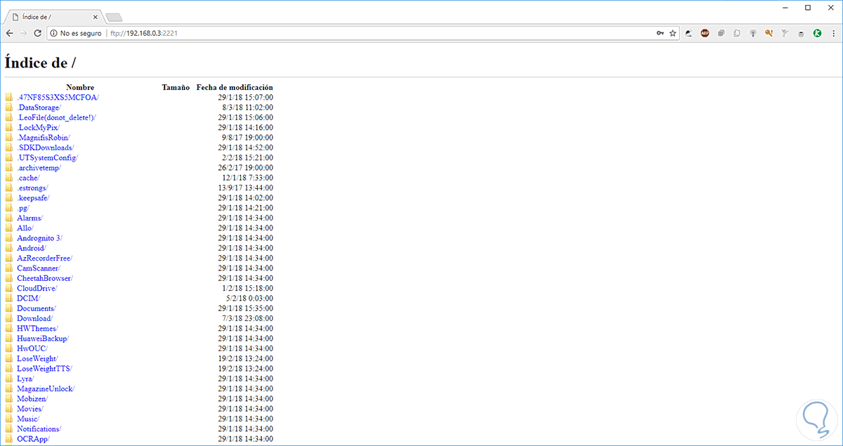 ftp://192.168.0.3:2221Al pulsar Enter tendremos acceso a la estructura de directorios de Android así: