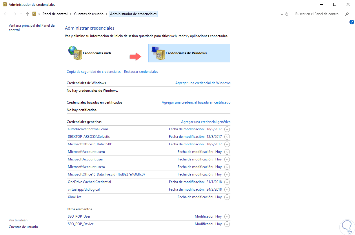 En la ventana desplegada iremos a la sección “Credenciales de Windows”: