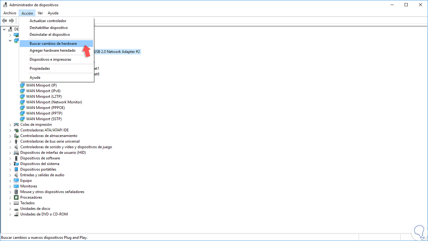 En caso de que este no sea actualizado, vamos al menú Acción y seleccionamos la opción “Buscar cambios de hardware”: