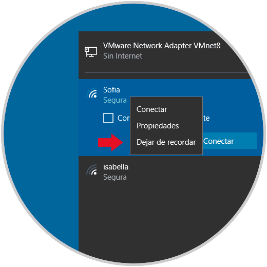 Para ello, daremos clic sobre el icono de red Wi-Fi ubicado en la barra de tareas y allí daremos clic derecho sobre la red Wi-Fi activa y seleccionamos la opción “Dejar de recordar”: