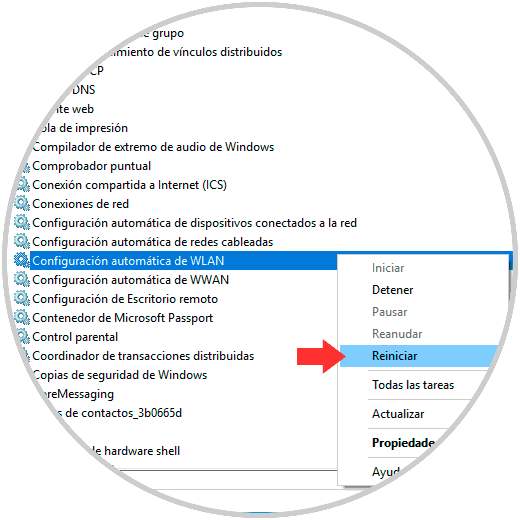 En la ventana desplegada ubicaremos el servicio llamado “Configuración automática de WLAN”, daremos clic derecho sobre él y seleccionamos la opción “Reiniciar”: