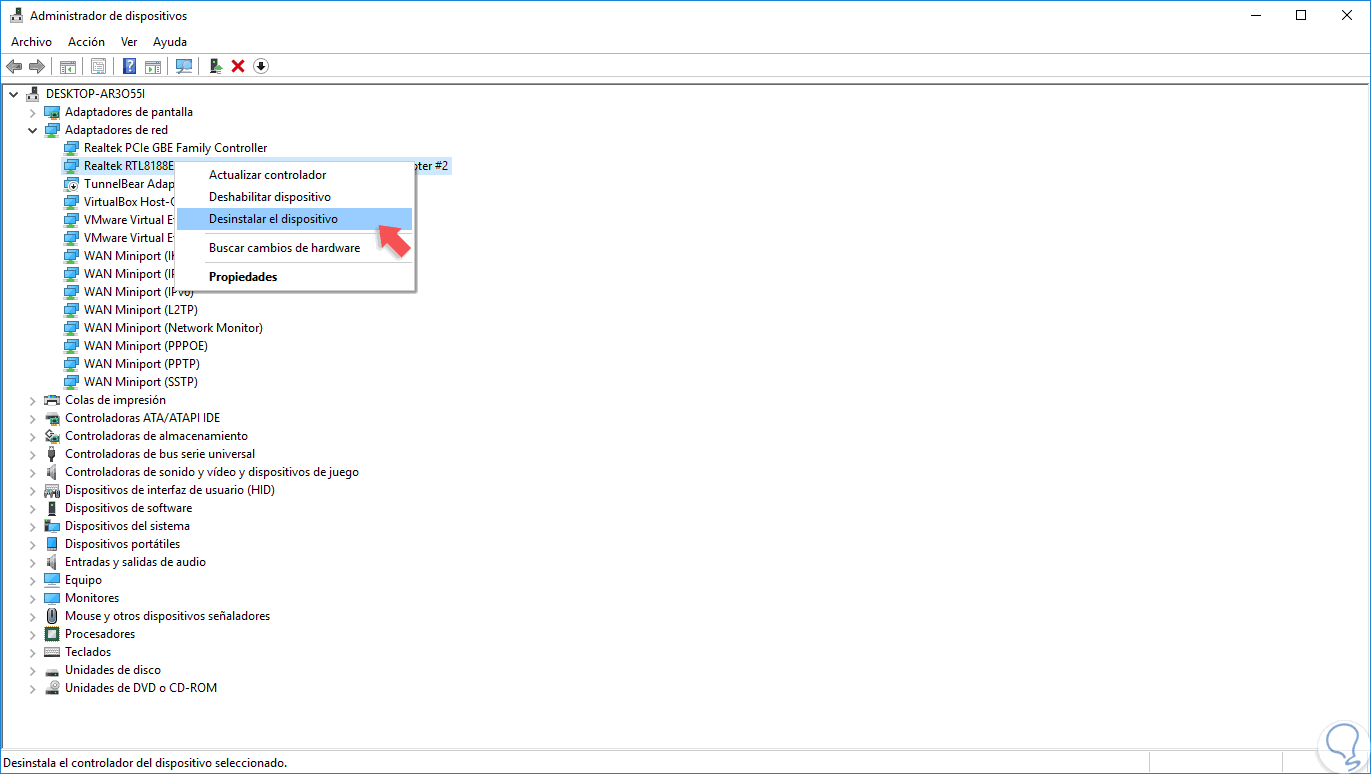 Para actualizar los controladores de red Wi-Fi vamos al administrador de dispositivos y daremos clic derecho sobre el adaptador Wi-Fi y seleccionamos la opción “Desinstalar el dispositivo”: