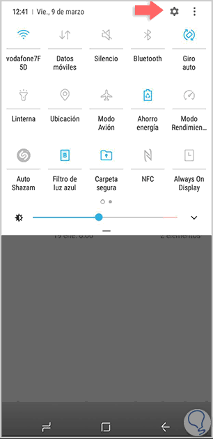 Deslizamos hacia abajo el panel de notificaciones de la parte superior y pulsamos sobre el icono de “Ajustes”.