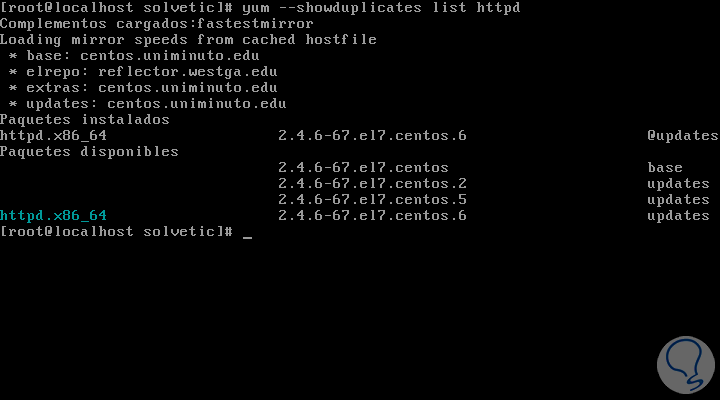 Otro problema en estas distribuciones es que al momento de buscar información sobre un paquete especifico, el comando yum sólo desplegará la última versión de ese paquete en el resultado de los subcomandos de información, lista o búsqueda. Para corregir esto, podremos recurrir al uso del parámetro --showduplicates, el cual se encarga de mostrar todas las versiones de paquetes activas en el repositorio.