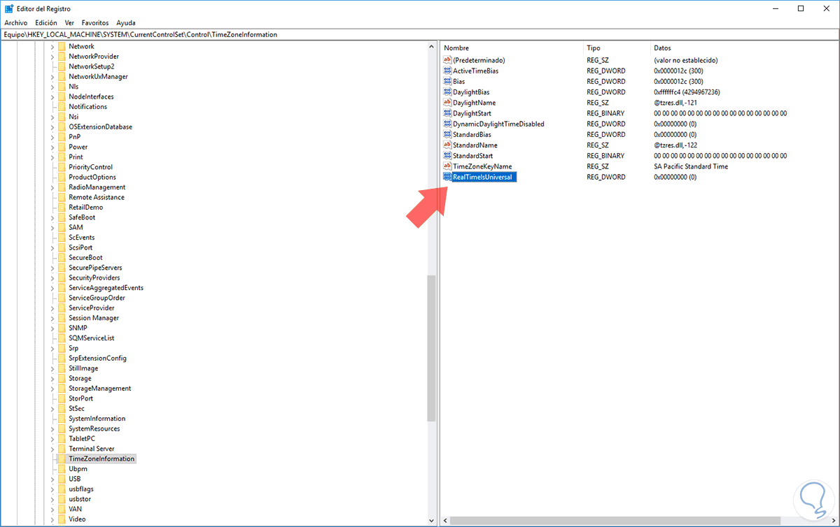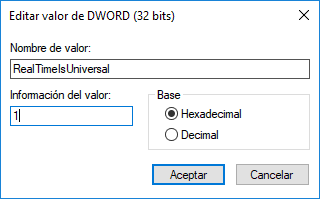 7. Cómo añadir el registro RealTimeIsUniversal en los registros de Windows 10 y reparar error reloj