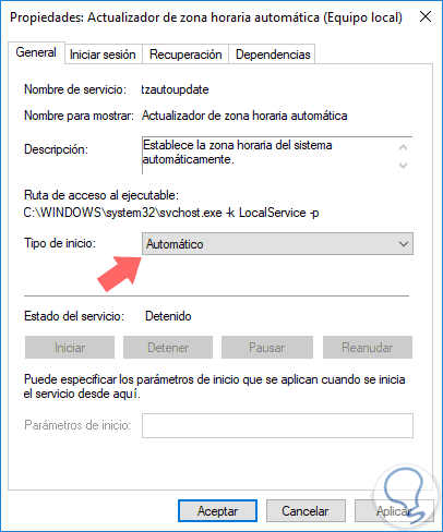 Para comprobar el estado del servicio de tiempo en Windows 10, usaremos la combinación de teclas Windows + R y ejecutamos el comando services.msc y pulsamos Enter. Allí ubicaremos el servicio llamado Actualizador de zona horaria automática y configuramos el valor Automático en el campo Tipo de inicio: