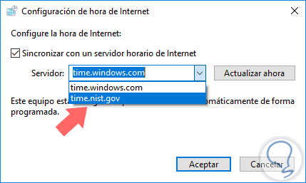 Pulsamos en el botón Cambiar la configuración y veremos que el servidor por defecto es time.windows.com, basta con desplegar sus opciones y seleccionar time.nist.gov: