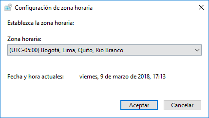 Pulsamos en el botón Cambiar zona horaria y en la nueva ventana seleccionamos alguna zona de la lista desplegable: