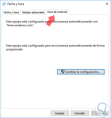 Allí pulsamos en Fecha y hora y en la ventana desplegada vamos a la pestaña Hora de Internet: