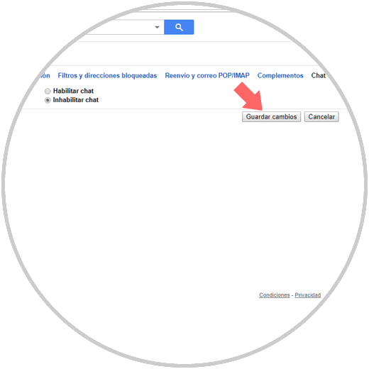 Por último verás dos opciones que hacen referencia al chat de Gmail. Pulsa en la opción “Inhabilitar chat” para desactivarlo dentro de la aplicación y después confirma en el botón “Guardar cambios”