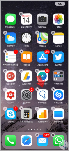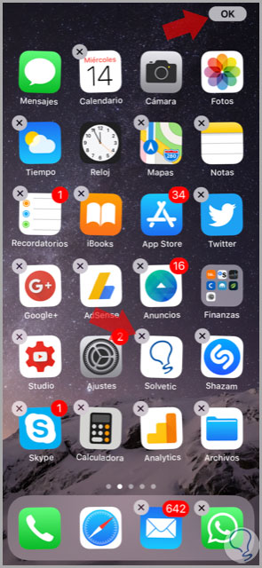 Pulsa el icono de la “X” en la parte superior de la aplicación que quieras eliminar en tu terminal iPhone. Cuando hayas terminado podrás salir de la opción de eliminar Apps pulsando el botón Ok en la parte superior de la pantalla que sustituye al clásico botón “Home” de modelos anteriores a la hora de salir de esta función