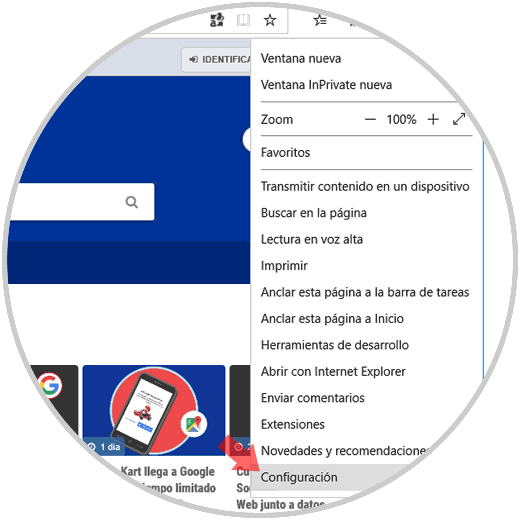 Para el caso de Microsoft Edge vamos a acceder al navegador, pulsamos en el icono de menú y seleccionamos la opción Configuración: