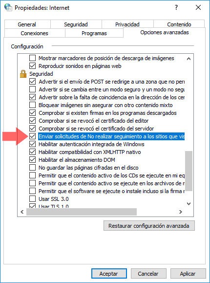En la ventana desplegada iremos a la pestaña Opciones avanzadas y allí, en la sección Seguridad, activaremos la casilla Enviar solicitudes de No realizar seguimiento a los sitios que visita en Internet Explorer: