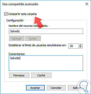 Allí pulsamos en la opción “Uso compartido avanzado” y en la nueva ventana activamos la casilla “Compartir esta carpeta” e ingresamos un nombre para dicho recurso compartido: