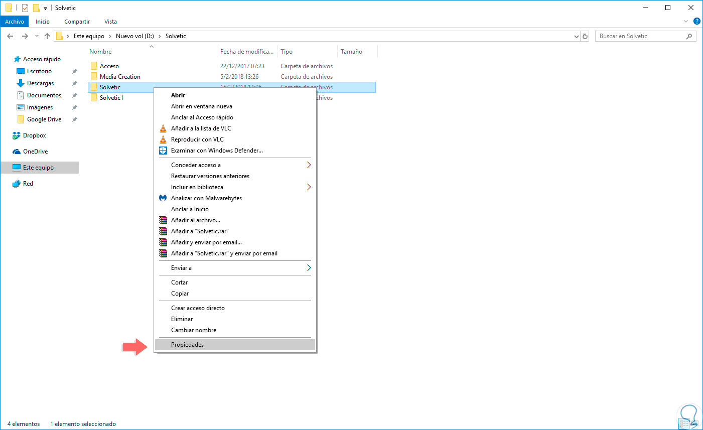 El primer paso que dar consiste en agregar a la carpeta de red los archivos que deseamos compartir y proceder a compartir dicha carpeta, para ello damos clic derecho sobre ella y seleccionamos “Propiedades”: