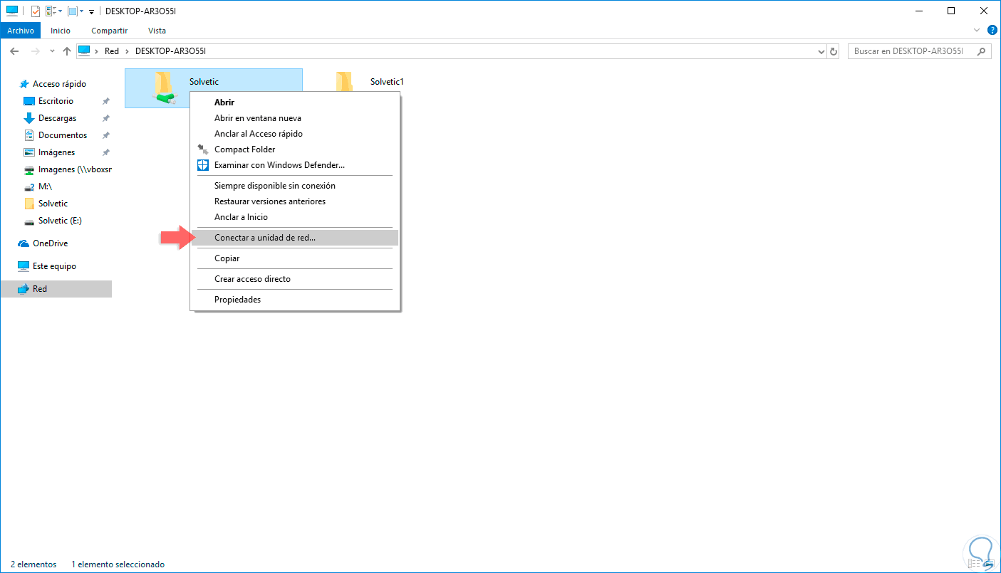 Para ello, vamos al explorador de archivos y allí nos dirigimos a la sección “Red” donde veremos los recursos compartidos en la red local, una vez acedamos, veremos el nombre del equipo o recurso donde se encuentra la carpeta compartida daremos clic derecho sobre la carpeta a conectar y seleccionamos la opción “Conectar a unidad de red”: