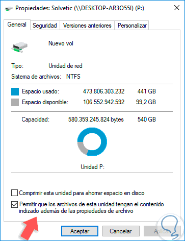 A continuación, daremos clic derecho sobre la carpeta que hemos conectado y vamos a la opción “Propiedades”, allí activaremos la casilla “Permitir que los archivos de esta unidad tengan el contenido indizado además de las propiedades de archivo”: