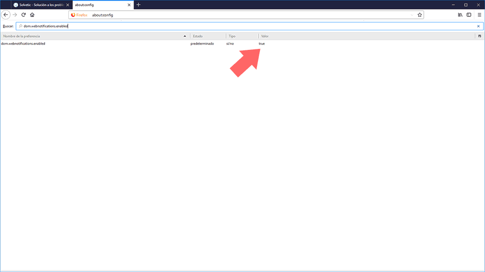 Allí daremos doble clic sobre la línea para establecer su valor en false y de este modo deshabilitar las notificaciones.