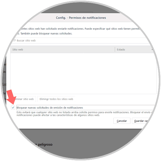 Allí daremos clic en el botón Configuración de la opción Notificaciones y será desplegado lo siguiente. Debemos activar la casilla Bloquear nuevas solicitudes de emisión de notificaciones.