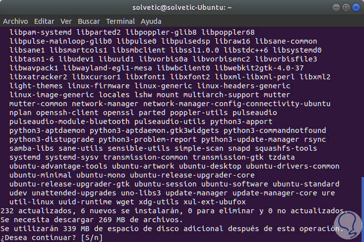 Más adelante será necesario ingresar la letra S para confirmar la descarga y actualización. Una vez el proceso finalice será necesario reiniciar el sistema para aplicar la nueva actualización del sistema.