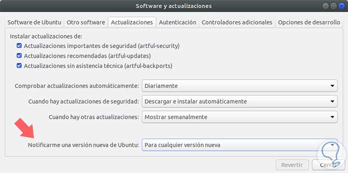 Allí seleccionamos Software y actualización y se desplegara la siguiente ventana donde seleccionamos la opción para cualquier versión nueva en el campo Notificarme una versión nueva de Ubuntu: