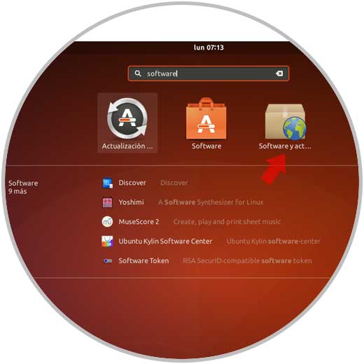 Ubuntu 17.10 cuenta con la herramienta Software y actualización al cual podemos acceder desde el buscador ingresando el termino software: