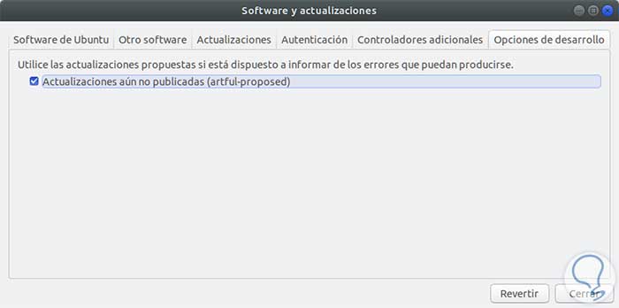 Ahora vamos a la pestaña Opciones de desarrollo y activamos la casilla Actualizaciones aun no publicada y será necesario ingresar la contraseña de administrador: