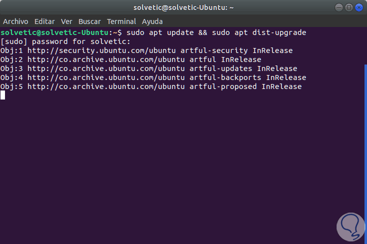 Una vez que las configuraciones de Software han sido definidas, vamos a la terminal y ejecutaremos el siguiente comando para actualizar el sistema, esto puede tomar algún tiempo en base a la velocidad de la red disponible: