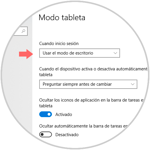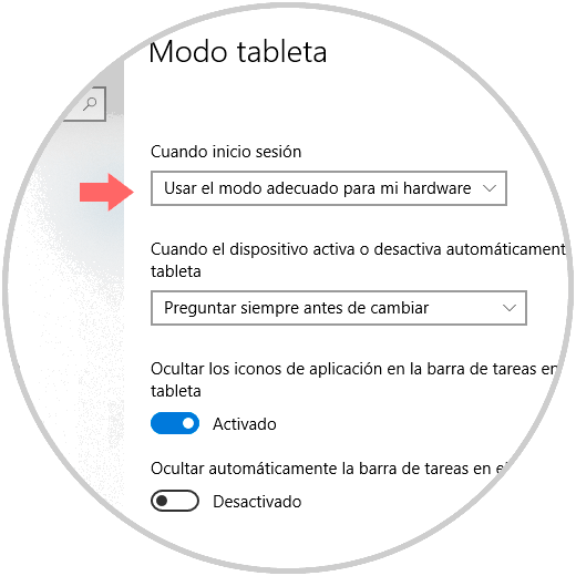 Podemos ver que el modo por defecto es “Usar el modo apropiado para mi hardware” con el cual Windows 10 detectara el tipo de equipo usado y así asignara la configuración correcta, de modo que, para evitar problemas, desplegamos las opciones del campo “Cuando inicio sesión” y seleccionamos “Usar el modo de escritorio”: