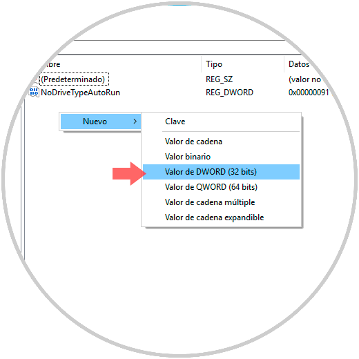 Allí daremos clic derecho en alguna parte en blanco de dicha ruta y seleccionamos la opción “Nuevo / Valor de DWORD (32 bits)”: