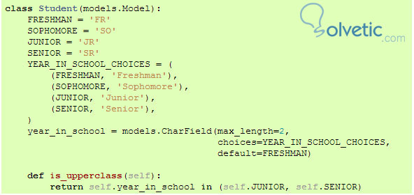 choices: Es una secuencia de dos tuplas que indican las opciones validas de contenido para un campo. El primer valor de la tupla será almacenado en la base de datos si es seleccionado, mientras que el segundo será el texto que se muestra al usuario para esa opción.