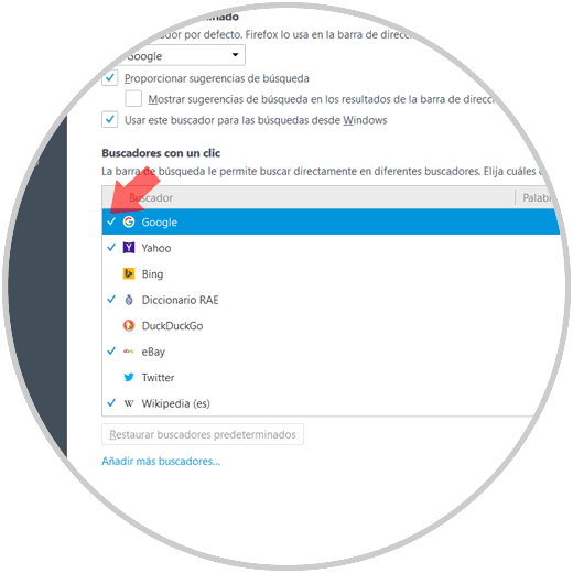 Haz click en la casilla de desplegar los motores de búsqueda. Los que se muestran aparecen marcados con un check azul mientras que los ocultos aparecen sin check. Puedes modificar estos check pulsando sobre ellos.