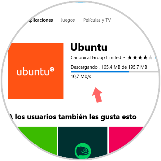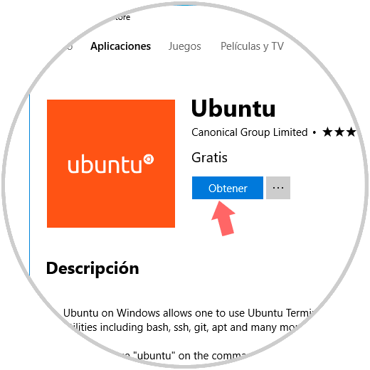 En la tienda buscaremos Ubuntu y será desplegada pulsamos en el botón “Obtener” e iniciará el proceso de descarga de Ubuntu: