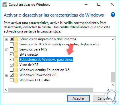 Allí pulsamos en la opción “Activar o desactivar las características de Windows” ubicada en el costado izquierdo y en la ventana desplegada activaremos la casilla “Subsistema de Windows para Linux”:
