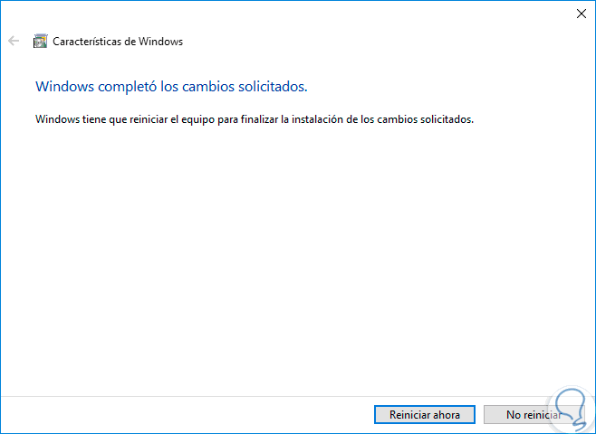 Una vez finalice veremos la siguiente ventana donde será necesario reiniciar el sistema para aplicar los cambios y activar la funcionalidad. Una vez el equipo sea reiniciado, vamos a la tienda de Windows y allí buscaremos las distros deseadas.