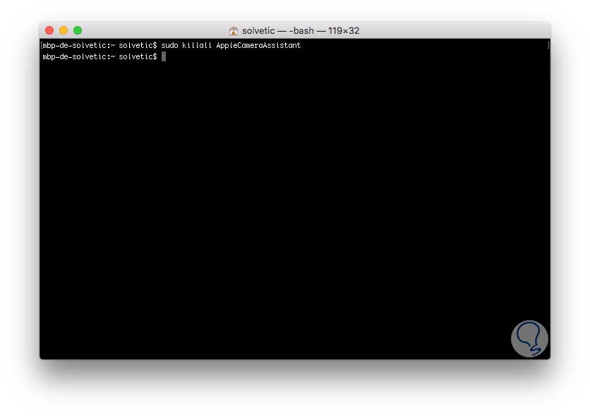 Ahora, forzaremos el cierre del proceso AppleCameraAssistant ejecutando: