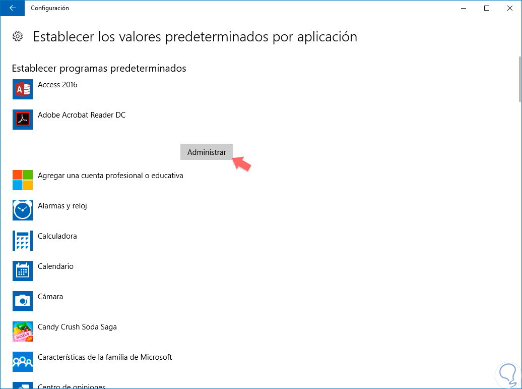 Seleccionamos el programa del que quieres restablecer las asociaciones, en este caso Adobe PDF y pulsa en “Administrar”.