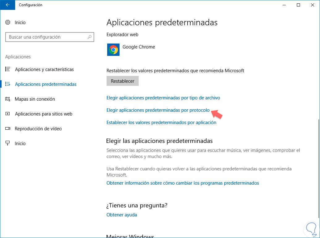 Dentro de la categoría de "Aplicaciones predeterminadas" seleccionamos en la parte derecha "Eelegir aplicaciones predeterminadas por protocolo".