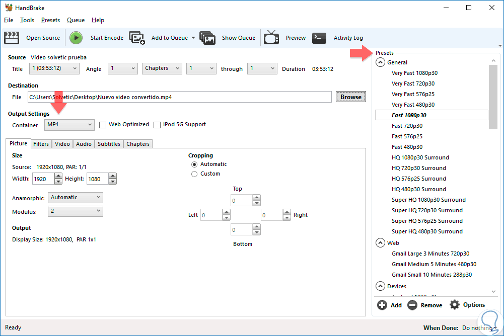 Una vez cargado el vídeo seleccionamos las opciones de conversión como el formato o los preset de calidad y la ruta de salida del nuevo archivo.