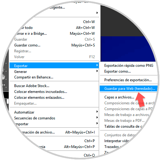 Ahora guardaremos esos marcos o frames como un GIF. Para ello vamos a “Archivo” – “Exportar” – “Guardar para Web”.