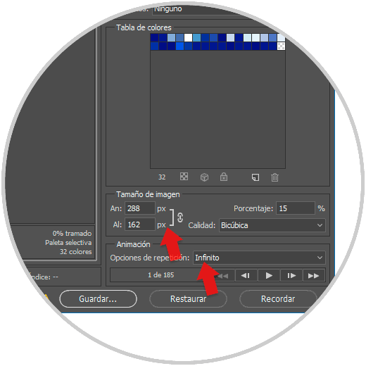 En la parte inferior puedes seleccionar las medidas de tu GIF y la calidad de exportación. También podrás seleccionar las opciones de repetición.