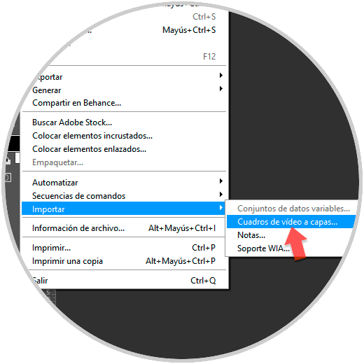 Abrimos Photoshop y vamos al menú “Archivo” – “Importar” – “Cuadros de vídeos a capas”.