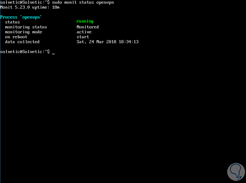sudo ln -s /etc/monit/conf-available/openvpn /etc/monit/conf-enabled/Siempre que realicemos alguna nueva tarea, debemos ejecutar el siguiente comando para comprobar que todo funciona correctamente: