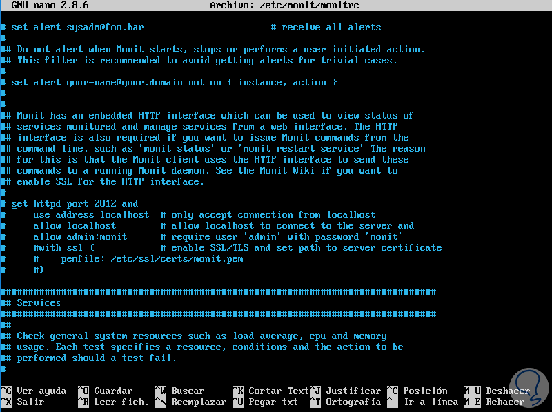 En este archivo será posible añadir más opciones de procesos a gestionar, crear alertas de correo o habilitar HTTPD. Para habilitar la interfaz HTTP integrada mediante la cual se puede ver el estado de los servicios monitoreados y administrar servicios desde una interfaz web, debemos ubicar la siguiente línea:
