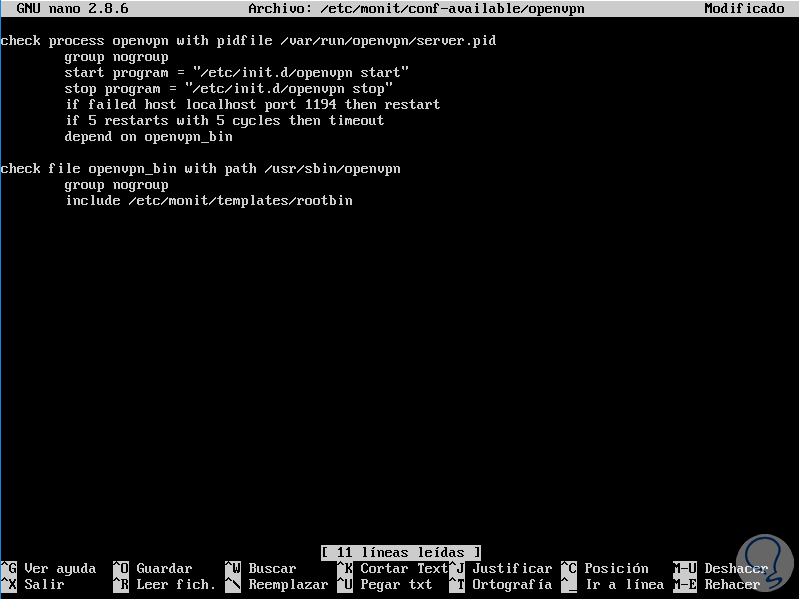 sudo nano /etc/monit/conf-available/openvpnEsto creará un nuevo archivo donde pegaremos lo siguiente:
