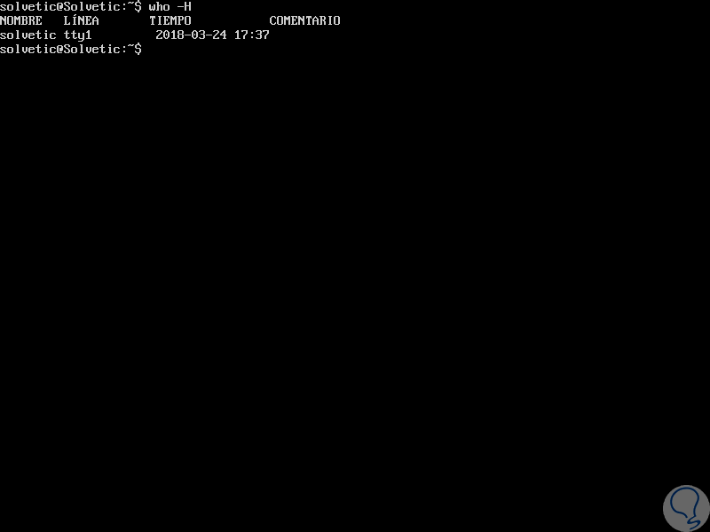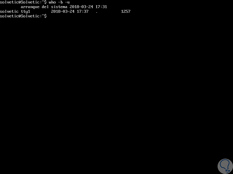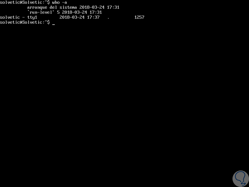 Este tipo de información está disponible en múltiples archivos de Linux, pero contamos con un comando que nos permite obtener esta misma información de forma muchos más simplificada y es el comando who. Who es un comando útil para generar información variada del sistema para facilitar nuestra tarea administrativa y hoy en Solvetic veremos algunas opciones sobre cómo usar este comando de forma práctica.