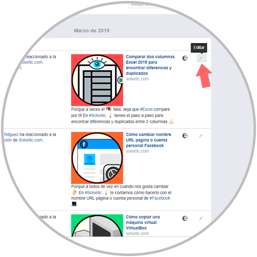 Ahora, vas a ver el registro de actividad de tu perfil dentro de "Facebook" (me gusta que has dado, personas que has seguido, comentarios que has hecho, etc...). Al lado de cada acción vas a ver el icono de un lápiz. Pulsa sobre éste en la publicación que quieras eliminar.