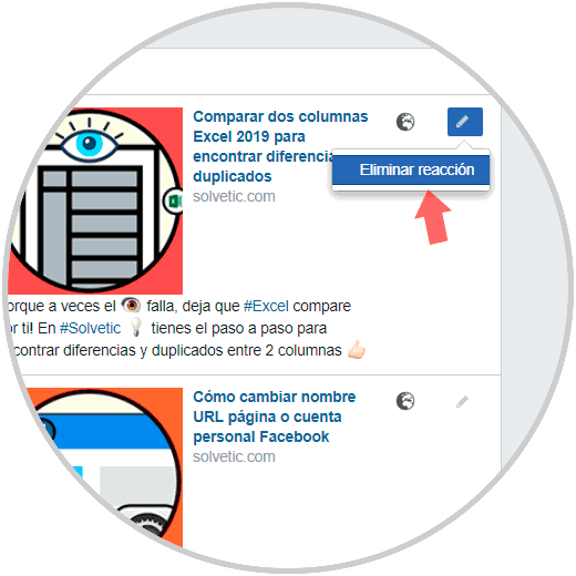 Ahora, se desplegará una ventana junto a estas opciones. Pulsa en "Eliminar reacción" y habrás eliminado esta acción en el registro de actividad de tu Facebook.