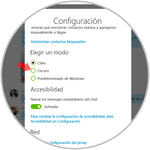 Aparacerá una nueva pantalla con las opciones de configuración de Skype. Desliza hasta que encuentres la opción “Elegir un modo” y pulsa la opción “Oscuro”